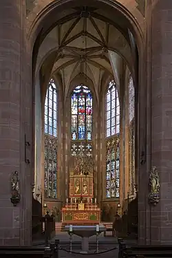 The interior of the church has been under restoration since 2011.[2] During this time, services are held at the cathedral and at the Heilig-Geist-Kirche. Excavations revealed a stone statue called Atzmann, which served as a stand for liturgical music. Similar stands are found in the Frankfurt Cathedral, Limburg Cathedral and Naumburg Cathedral.[5] Five of the Gothic window panes were moved to a convent in Heidelberg in the 18th century, but are planned to be returned to their original position. One of them shows the patron saint.[4]