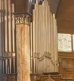The pipe organ in the church is also of historic interest. When the Farand and Votey organ was purchased, two train cars were required to bring the parts to Dubuque. Because the train could not get across the river, barges than were used to float the parts over so that they could be installed in the church. The organ has about 1,000 pipes. At the time of installation, it was one of the largest organs in the area, however over the years it has been eclipsed by others. The pipe organ contains 36 ranks or pipes, about 2,200 total and was restored in 1992 by the Fowler Organ Company, Lansing, Michigan.