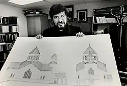 Very Reverend Khajag Hagopian holding a drawing of St. Mary Armenian Apostolic Church