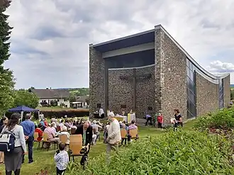 Wörsdorf had only few Catholic inhabitants until the end of World War II, when many people arrived as refugees who were expelled from Silesia, East Prussia, Sudetenland and Hungary. They were transported by bus to church services in St. Martin, Idstein.[1] Plans to build a local church resulted in a 1959 commission to Johannes Krahn,[1] who built several churches and early skyscrapers such as the Beehive House in Frankfurt am Main. It was first also meant to serve as a Autobahnkirche for the near-by highway.[2] That purpose had to be given up when a planned exit was not approved.[2] Construction began in 1961,[1] and the church was consecrated on 8 December 1962. It was dedicated to Nicholas of Flüe, and named Friedenskirche ("Peace Church").[1][3]