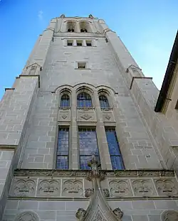 The church grew along with the city of Houston, and in the late 1920s, members launched a campaign to raise money for new and larger facilities. Jesse H. Jones, Walter Fondren Sr., and James Marion West Sr. each contributed $150,000, and the church hired noted architect Alfred C. Finn to design a new building at the corner of Main and Binz streets. The Neo-Gothic styling features a cruciform plan on a steel-frame structure with limestone cladding. Stained glass windows are from the original structure, and the tower houses bells also brought from the church’s original sanctuary. It has been described as "one of Houston's grandest houses of worship."[2]