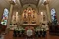 However, the interior style is not Spanish Colonial but rather Romanesque Revival. St. Peter Catholic Church is the oldest standing romanesque revival building in Alabama. The interior was styled according to a traditional rectangular basilica plan, used since the fourth century. Three custom wooden altars were installed in the 1890s, replacing less elaborate ones. They were made in a Victorian Romanesque style, painted cream, and trimmed in gold, and almost reached the ceiling. The high altar features a statue of Jesus in the middle with a separate angel statue on each side. The left altar displays a statue of the Virgin Mary and the right displays St. Joseph and The Holy Child. The interior also holds fourteen Victorian style, stained glass windows. Dating from 1922, these windows were made by Emil Frei Art Glass Co. of St. Louis and Munich in Germany. The small statues for the stations of the cross along the walls are made out of polychrome plaster.[1][4]