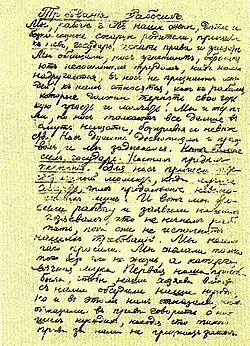 In any case, on the night of January 6–7, Gapon, having familiarized himself with the options proposed to him by the intellectuals, rejected them all and wrote his own version of the petition, which went down in history as the Petition of January 9, 1905.[3] The petition was based on the March "Program of the Five", which was included in the first version of the text without any changes.[3] An extensive preface was added at the beginning, containing an appeal to the tsar, a description of the workers' plight, their unsuccessful struggle with the factory workers, a demand to abolish the power of officials and to introduce popular representation in the form of a constituent assembly. And at the end there was an appeal to the tsar to go to the people and accept the petition.[4] This text was read in the sections of the Sobranie on January 7, 8 and 9, and tens of thousands of signatures were collected. During the discussion of the petition on January 7 and 8, some changes and additions were made, and the final text of the petition took on a more popular character.[3] On January 8, this final, edited text of the petition was typewritten in a number of 12 copies: one for Gapon himself and one each for the 11 departments of the "Sobranie". With this text of the petition, the workers went to the tsar on January 9, 1905. One of the copies of the text, signed by Gapon and the worker I.V. Vasiliev, was later kept in the Leningrad Museum of the Revolution.[8]