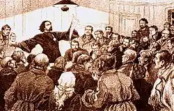 The reading of the petition usually proceeded as follows. The next group was let into the hall, and then one person gave a speech and another started reading the petition. When the reading reached the specific points of the petition, the speaker would give a detailed interpretation of each point and then address the audience with the question, "Right, comrades? — "Right! .... So!..." — the crowd replied with joy.[34] In cases where the crowd did not give a unanimous answer, the point in question was interpreted again and again until the crowd agreed. Then the next clause was interpreted, then the third, and so on until the end.[7][35] When agreement had been reached on all points, the orator would read the last part of the petition, which expressed the workers' willingness to die on the walls of the royal palace if their demands were not met. He then addressed the audience with the question, "Are you prepared to stand for these demands to the end? Are you ready to die for them? Do you swear to do so?" — And the crowd responded with a chorus: "We swear it! We'll all die as one!" Such scenes took place in all sections of the Sobranie. According to numerous testimonies, there was an atmosphere of religious exaltation in the sections: people were crying, beating their fists against the walls and swearing to come to the square and die for truth and freedom.[7]