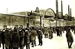 In December 1904 there was an incident at the Putilov factory when four workers who were members of Gapon's "Sobranie" were dismissed. At first this event was not seen as particularly important, but then a rumor spread that the workers had been fired because of their membership in the "Sobranie". This was perceived by the capitalists as a challenge to the Sobranie, and at an emergency meeting on December 27, 1904, on Vasilyevsky Island, the leadership of the Sobranie decided to demand the reinstatement of the dismissed workers.[21] If the demands were not met, it was decided to declare a strike at the Putilov factory and, if necessary, to extend it to all the factories in St. Petersburg. The question of a petition was also raised at the meeting, and after heated discussions it was decided to issue a petition only if the workers' economic demands were not met. The decisive speech was made by A.E. Karelin, who declared that by submitting a petition the workers would rid themselves of the reputation of being "Zubatovites".[15] From that moment the conflict between Gapon and the opposition disappeared, and everyone united in the struggle of the factory workers against the factory owners. Gapon himself expected that the workers' demands would be met and that the matter would not come to having to submit a petition.[13]