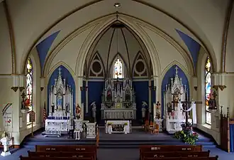 Some of the parish's members lived in the village of Chickasaw,[3] nearly 2 miles (3.2 km) to the southeast.[4] During the 1890s, movements grew among the Chickasaw members for the creation of a separate parish; they built a parish hall in 1894 and succeeded in having it declared a chapel of ease in the following year.[5] Unrest between the Catholics of Chickasaw and the parish's other members culminated with the destruction of the church:[3] on January 12, 1903, soon after many of the Chickasaw parishioners separated from St. Sebastian's, the church and its contents were burned to the ground.[5] In the aftermath of the fire, an investigation was conducted under the supervision of Archbishop Elder. Although the fire was deemed suspicious, a separate parish was created in Chickasaw as a result of the fire, while St. Sebastian parish began the construction of a new church in 1904; it remains standing today.[3]