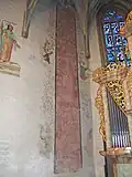 Among the oldest wall paintings is the painted red tapestry on the chancel north wall, which was uncovered in 1965 and can be stylistically dated to around 1515. It is a narrow, high brocade pattern that reaches to the vault and is framed by six floating angels arranged in pairs that hold the carpet. It probably formed the background of a tower-shaped sacrament house standing in front of the wall. Another painted tapestry, dating from approximately the same time, is located on the northern choir arch wall of the nave at the entrance to the pulpit. It was also uncovered in 1965. It probably served as the background of a side altar.[8]