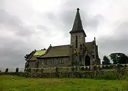 The church is built of gritstone and has a stone slate roof. It consists of a three-bay nave with a north aisle, a three-bay chancel, and a northwest steeple and porch. The steeple has a tower with two stages, stepped angle buttresses, tall lancet bell openings, deep corbelled eaves and a tall pyramidal spire with lucarnes and a finial. The porch is up seven steps, and is entered under a pointed arch with a chamfered surround. Most of the windows have trefoil heads.[1][2]
