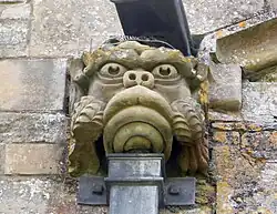 The window hood moulds are similar to the south chapel but run into a further cill band around the north and east wall. Within the central bay of the north wall is a chapel doorway opening that breaks through the plinth. The opening is a twin-mould recess, with arch above surrounded by a hood mould. The door planking is set behind raised and studded rails and stiles with inset moulded blind lights. The chancel east wall between the chapels is plain except for a simple cill band above the roof line, and a shallow coped gable with a central cross above. The chancel east window is of three lights with cinquefoil heads set in a moulded frame. Pevsner states that the window "makes an odd east view with the chancel east window, smaller, recent, and straight-headed, between."[1][8] Two spouts, dressed with gargoyle heads, drain the roof between the chancel and the chapels.