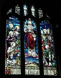 The south chapel east window is dedicated to Sir Montague Aubrey Rowley Cholmeley, 4th Baronet, (1876–1914), who, as a captain in the Grenadier Guards, was killed in action near Festubert during the First World War. Each side of the Edmund Chomeley monument is a stained glass window, the one to the west dedicated to Sir Hugh Arthur Henry Cholmeley (1839–1904), 3rd Baronet, and erected by his wife and children. A further stained glass window dedicated to Lady Cholmeley, widow of Hugh Arthur Henry Cholmeley, was erected in 1911.[6] At the west of the south chancel chapel is a wall monument to Alice (died 1678 aged 24 years), the wife of Montague Cholmeley, and the daughter of Sir Richard Brownlow of Great Humby and sister of Sir John, and William Brownlow. Alice produced five children to Montague, three of whom—John, Alice and Mary—predeceased her.[18] The monument is white marble, its plaque inscription within a field set below flat moulding with part inset quarter-circles at bottom left and right. The plaque is supported by scallop shell and scrolling with swagged and tied ribbon motifs each side. Above the plaque is a cornice, the top of which is a deep curved cushion moulding with raised scallops. Above the cornice is a heraldic shield vertically divided red and brown, with helm and crest above.