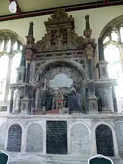 The monument is described by Kelly's Directory as: "richly carved and gilt, and upon the base within arched recesses are kneeling effigies of the parents, and in smaller recesses effigies of two sons; intermediate columns support a cornice of panel work, enriched with armorial bearings and ornaments"[6][16] The stone monument was originally completely painted and gilded. Henry and Elizabeth sit within an aedicule and kneel facing each other in prayer either side of a gabled ark, in front of which lies a covered small child with head on pillow. Columns flank the figures, beyond which kneels a further figure of a son each side, set in front of an arched recess under a portico of four columns, and slightly set back; plinths above the canopies are topped with plain square tapered black columns as pinnacles.[1][6][8] The columns either side of Henry and Elizabeth are headed by Corinthian capitals that sit beneath an architrave, frieze and cornice that continue across the monument but set back. Below the set back frieze, and enclosing scrollwork and a memorial plaque, is a chamfered arch with a spandrel each side containing a roundel with embossed decoration. On the frieze run recessed oblong panels separated by relief heads. Above the cornice the line of the columns is continued by plinths, supporting tapered pinnacles topped by moulding and ball. Above the set back cornice is a complete heraldic achievement set within square columns decoratively embossed, and with scrollwork as support at the sides, and topped by a further architrave, frieze and cornice reflecting those below, above which is further scrollwork.
