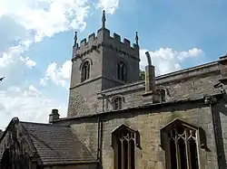 The tower is of three stages. The lower stages might be part of an 11th-century previously unbuttressed tower, and contains at its west side an early 15th-century chamfered reveal window opening with pointed arch surrounded by a hood mould with label stops in human form. The inset Perpendicular window is of three lights of panel tracery below, and six above. The panels are headed with trefoils, the lower within ogee heads. A church clock is just below the belfry stage. Between the window and clock is a hooded slit window, a repeat slit window is on the north and south sides. The Belfry stage was added in the 13th century and is defined at its base by a string course with repeating dentils. Central to each side of the belfry stage is a chamfered window opening with a plain hood mould following a semi-circular head. Within the opening are louvered and pointed twin-lights, these separated by a central octagonal shaft with a trefoil opening above in the north and south windows. The roof line is defined by a further string course with repeated grotesque bosses, and pairs of gargoyle drains on each side. An embattled roof parapet with crocketed corner pinnacles sits above. The tower is partially clasped at the north and south by the church aisles, and on the north side by an ashlar three-stepped angled buttress against the lower stages.[1][8]