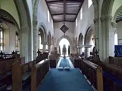 The interior dimensions of the church give the nave and side aisles at 42 feet (13 m), and the chancel and chancel chapels at 38 feet (11.6 m) long. Both the nave and chancel are 18 feet (5.5 m) wide. The north chancel chapel is 16 feet (5 m) wide and the north aisle, 12.5 feet (3.8 m). Both the south chancel chapel and south aisle are 12 feet (3.7 m) wide.[18] Pevsner describes the interior as "sadly scraped"—scraping a typical 19th-century restoration method of cleaning and retooling.