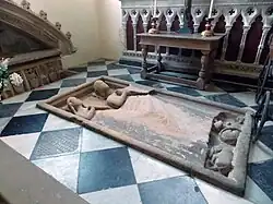 The Christopher Turnor monument sits on a black-and-white marble-tiled raised level. Within this level is set a worn sculpted medieval monument, supposed the early 14th-century memorial to John de Neville and his wife, with two recumbent figures—the man in chain armour, the woman with a wimple—draped from elbow to ankle and set within a sunken field. A dog lies at the feet of each figure, and a shield with three Fleur-de-lis lies partly over the man. Set into the raised floor against the north wall is a recessed table tomb with inset panels with angels holding shields, above which is a curved and moulded canopy arch with embedded fleuron repeats and a crocketed top running to a cross-shaped floriate finial. The origin of the monument is unknown.[1][15][22] Next to the de Neville monument and set into a marble tile is a lozenge-shaped metal plaque to Florence Amy Laura Neville (died 1934 aged 85 years), daughter of Henry Martin Turnor who was the son of antiquarian Edmund Turnor (1755–1829) and brother of Christopher Turnor (1809–1886).