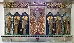 St Andrew and St Mary's was restored during the first half of the 19th century at a cost of £2,000, provided by the Turnors, Cholmelys and others.[13] An 1846 restoration added a lower chancel roof, and a lath and plaster chancel arch which was removed by a further restoration in 1936, revealing the down face of the chancel roof below the chancel arch apex. A further tower restoration took place in 1946.[21][22][23] The chancel reredos was added in 1911, designed by Mary Fraser Tytler, the wife of George Frederic Watts.[8]