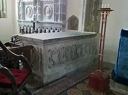 Beneath the window on the east wall of the north chapel is an 1896 "fine memorial" sepulchral reredos to Christopher Turnor (1809–1886) and his wife Lady Caroline (Finch-Hatton),[6] designed by Turnor himself. Christopher Turnor undertook the rebuilding of Stoke Rochford Hall in 1846, was an MP for South Lincolnshire, and was a designer and provider of Lincolnshire farm complexes. Lady Caroline was the daughter of George Finch-Hatton, 10th Earl of Winchilsea.[27][28] The memorial is of white marble.[1] The table pedestal is faced with twelve twinned column reliefs, leading to ogee headed and cusped arches, with quatrefoils in circular devices between each. Above are three decorative gabled and pinnacled relief structures supported by slender columns, with inset niches containing saints, inscriptions, and geometric and floriated details, separated by a crocketed frieze. Two panels between contain roundels with profile relief portraits within a circular moulding.