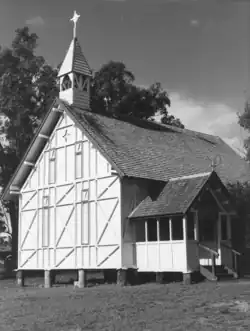 Leyburn is a rural village on the southern reaches of the Darling Downs, some 50 kilometres (31 mi) northwest of Warwick, on the banks of Canal Creek. St. Augustine's Church is located on the north-eastern approach to the village from Toowoomba, Dove Street. The church is timber of outside stud framing on low timber stumps with a steeply pitched gabled roof clad in hardwood shingles. It is reputedly styled on English village churches of the period, expressing many Gothic elements in a vernacular form of construction.[1]