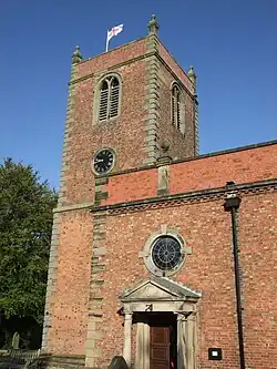 The church is constructed of brick with stone dressings.[1] It is believed that the stone pillars inside the church are from the previous building. The exterior walls are of locally made brick, and the quoins and finials were made of stone from a quarry at Manley near Macclesfield.[3] The plan of the church consists of a three-bay nave with a choir. At the east end is a shallow apse. The tower, in neoclassical style, is at the west end.[1] The date 1702 is picked out in glazed bricks on the tower, either side of the clock face. On its west face are two round headed windows, one above the other.[4] On the south face is a clock which is balanced by stained glass bull's eye windows in the other faces. Above these are louvred two-light belfry windows. At the top of the tower is an ogee cornice and a parapet with ball-topped finials at the corners. Over the north and south doors are bull's eye windows. The nave and chancel windows are round headed. Above these is a cornice and a solid red brick parapet, interrupted by ball-topped pilasters over each window on the south side. Externally on the east wall is a 17th-century slate armorial memorial.[1]