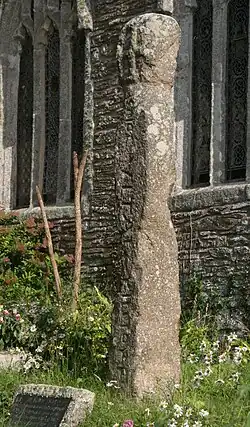 The churchyard contains an inscribed stone cross: the first word of the inscription is perhaps isnioc (later opinion believes ignioc).[3] The inscription is Ignioc Vitali fili Torrici (i.e. Ignioc son of Vitalus son of Torricus) and the dating is 5th to 7th century. Another inscription is in Ogham, perhaps partly in Irish.[9] The inscriptions are both older than the carving of the upper part into a cross.[10]