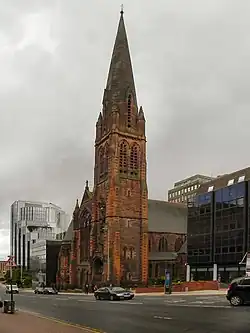 The church building in Glasgow's St Vincent Street was opened on Saturday 17 September 1904,[2] and is built in the Gothic Revival style. It was designed by architects Tennant and Burke and was protected as a category B listed building starting in 1970.[3] In 2022, its listing was upgraded to category A.[4] Because of its size and association with Gaeldom and the Gaelic language it is also popularly known as the Highland Cathedral.
