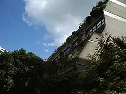 The architects, Design 5, used a ziggurat style of building (similar to the Brunswick by Patrick Hodgkinson), retaining much of the open space whilst creating 300 dwellings. Parts of the double walls surrounding the burial ground - reputedly designed to frustrate grave robbers - have been preserved along with a number of tombstones.