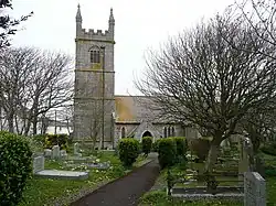 The church dates from the 13th century. The tower is 15th century, but most of the church was rebuilt by Edmund Sedding in 1865–1867. The south aisle and arcade were removed and a new south transept was built. The shafts, capitals and bases of the arcade were preserved and used in the construction of a new Lych-gate. The north and south walls of the nave, the transepts and a portion of the chancel were rebuilt. The aumbry from the north transept was restored. A two light window, placed in the south aisle by the Rector a few years previous, was moved to the north wall of the north transept. The end window of the south transept was new. The window in the south wall was filled with stained glass designed by Sedding and made by Mr. Beer of Exeter in memory of the deacon and curate, Mr. Drury, who drowned in 1865. The old north and south doorways were rebuilt. The tower was reopened and the arch thrown into view. The pinnacles of the tower were repaired. The roofs of the nave, transepts and chancel were replaced. The chancel roof was embellished with carving from timber taken from the church at Phillack, which had been restored 10 years before.[3] The reredos was painted by John Sedding, brother of the architect.