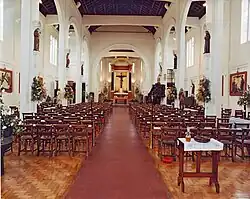 It was the first large church in England to be built almost entirely in reinforced concrete, including all the principal internal furnishings within the church (which are of finely-finished concrete), the Presbytery, which is attached to the church, and even the boundary walls.[3] The experimental nature of this construction, however, meant that the composition of the concrete allowed acidic water to leach through and rust the metal core of the walls. By the 1990s the church structure was showing significant signs of degradation and had to be substantially reinforced, with the Heritage Lottery Fund part-funding the repairs. The church was re-hallowed in June 2002.