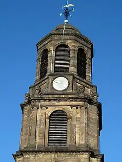 The church was constructed between 1791 and 1795 to a design by Charles Watson of Doncaster and York. It was altered in 1885 and then extended in 1905 to designs by John Thomas Micklethwaite.[1] The church was not built in isolation but as the centrepiece of a new development to the North of Wakefield City Centre and matches much of the other Georgian architecture in the vicinity and is the sole large development in Wakefield of this era. The tower was rebuilt in 1885 also to a design by Micklethwaite and other internal alterations were made at this time.