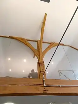 The internal wooden roofs of nave and chancel were described in 1887 as "waggon-headed"; that is to say that the ceiling above the trusses was in the form of a round arch like the cover of a wagon. This type of roof was believed to give "good acoustic properties."[9] In 1887 there was a font, paid for by W.H. Jessop, a carved wooden pulpit given by Mrs Foster in memory of Mr Laycock, and a brass lectern funded by Mrs Laing.[13]