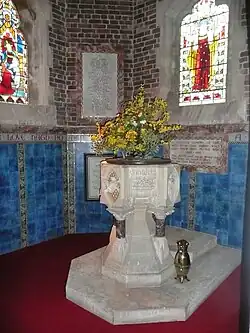 The church was designed in the French Gothic style of Late Gothic Revival architecture.[6] It was built using stone from the Earl of Abergavenny's own quarries and Bath stone for the carvings. The spire is 130 feet high.[6] Inside, the font and pulpit were made from Caen stone. Its stained glass windows were installed as a memorial to the Earl when he died and depict the four major prophets and the Four Evangelists.[6] Roumieu was given freedom in his design of the building, which was referred to by Building News as "acrobatic gothic".[3]