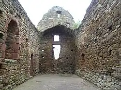 The surviving nave measures 16.84 m (55.2 ft) by 5.03 m (16.5 ft). The walls are built of irregularly coursed red sandstone with ashlar dressings. Interesting features include the pointed barrel-vault which survives at the west end of the building and a round chancel arch. Doorways exist on the north and south walls. Narrow round-headed windows survive on both the north and south. The remains of a round-headed piscina with basin lies to the south of the chancel arch.[2]