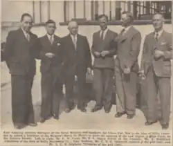 Western Morning News. Thursday 17 August 1939. Jeffery Amherst, 5th Earl Amherst, general manager of the Great Western and Southern Air Lines Ltd., marking the opening of the new airport. Left to right: Mr. C.W. Cross, Mr. P.E. Stuart (Clerk of the council), Mr. A. Woodcock (Chairman of the Isles of Scilly Steamship Co.), Earl Amherst, Mr. C.P.O. Stideford (captain of the golf club), and Mr. A.C.V. Stephens (treasurer of the golf club).