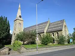 The church is built of sandstone with Welsh slate roofs, and consists of a nave, a south porch, a chancel, a north vestry and a southwest steeple, and is in Gothic Revival style. The steeple has a tower with two stages, angle buttresses, a stair turret, tall two-light bell openings, and an octagonal broach spire with a clock face. There are a variety of two- and three-light pointed windows in the nave and vestry, and single lights and a four-light east window in the chancel. Inside, there is a hammer beam roof in the nave, a trefoil piscina, and some wall memorials, one dating from 1738.[2][3]