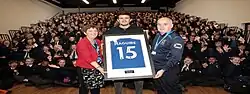 Footballer Harry Maguire presents a signed shirt to Mrs. Cain and Mr. McKee on 10 January 2018.