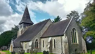 The present church has flint walls with stone dressings and stepped buttresses, a plinth, and corbelled tracer lights in the nave.[1] The west tower was rebuilt in 1890 and has diagonal buttresses with an elaborate arrangement of steps (some with gabled ornamentation), and at the top is a timber turret, surmounted by a broach spire.[1] A small mural monument at the south-east of the chancel is to Nicholas Holdip, "pastor of the parish" 1606.[1] In the north aisle wall is another mural tablet to "Robert Hunt of Hall Place in this Parish", 1671, with the arms, Azure a bend between two water bougets or with three leopards' heads gules on the bend.[1] The crest is a talbot sitting chained to a halberd. There are four bells; the treble and second by Joseph Carter, 1601, the third by Henry Knight, 1615, and the tenor by Joseph Carter, 1607.[1] The church became a Grade: II* listed building on 31 July 1963.[2]