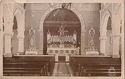 The most significant change to the church since its construction in 1893 was the completion of the sanctuary, including vestry and sacristy, in December 1929. Designed by Cavanagh and Cavanagh Architects in a similar manner to the original building, the sanctuary was constructed of reinforced concrete and brick by B. Robinson. The third Archbishop of Brisbane, James Duhig, officially opened the additions. The interior of the chancel with its marble wall linings and altar rails, terrazzo floors, domed plaster ceiling and stained glass windows was more ornate than the rest of the church. A new marble altar by sculptor and monumental mason, Frank Williams of Ipswich, who carried out all the marble work, was installed. The original chapel, no longer required for school purposes, was demolished at this time.[1]