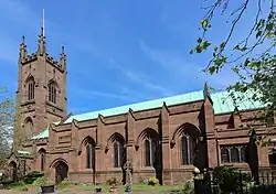 Associated with the church are four structures also listed at Grade II. The sandstone churchyard wall dates from the 19th century. There are three entrances with stone piers; all originally had iron overthrows supporting lanterns, but only one has survived. In the west section of the wall is a red granite drinking fountain. This was added in 1861 and paid for by Charles Pierre Melly; it is one of the earliest drinking fountains in England.[10] In the churchyard, to the south of the church, is a sundial dating from the late 17th or the early 18th century. It consists of a baluster on a square step; the gnomon is missing.[8][11] In the east wall of the churchyard is a former sandstone hearse house, of which only the façade remains. It dates from the early 19th century, it has a pointed entrance and a cornice, and is crenellated.[12][13] To the left of the hearse house is a former mortuary. This is also in sandstone, dates from the early 19th century, and, again, only the façade remains. It has a pediment with a cornice and acroteria.[12][14]