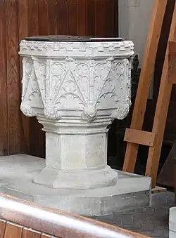 The clerestory, of the early 15th century, has on each side six windows and a horizontal band of flushwork panels. The south porch was rebuilt in 1908. Inside, the chancel, nave and aisles with three-bay arcades date from the 14th century. The organ, at the west end, is set in front of the blocked tower arch. The font, near the door, is of the 14th century; it is octagonal with crocketted gables, fine tracery and brattishing around the top of the bowl. The pews, dating from 1893, have carved figures and animals at the ends of the benches.[1][2]