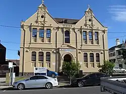 During the early 1890s plans for a completely new church were well underway, and, hampered only by a lack of funding, work progressed slowly. The new church opened in February 1900 while the old church became both a parish church hall and classroom. By 1907 the school was offering classes for girls up to the Merit Certificate (Grade 8) level. The old building was soon after condemned by the local board of health which necessitated the need to draw up plans to build a new girls school. Demolition of the old church was completed in 1913 and the foundation stone for the new school was laid early the following year. The new school was to cater for 500 students and so a two-story building of red brick, comprising nine classrooms, was constructed on Victoria Street.[4] On 5 July 1914 the building, designed by Kempson and Conolly, was formally opened by Archbishop Mannix.[5]