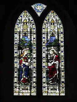 The church was built on hilly ground overlooking Bolney from the south, and was reached by a twitten (a narrow lane) from the village street.[7][8] The core of the Norman building consisted of a nave, a narrower chancel set at an angle,[5] one window in the east wall and the doorway in the south wall of the nave.[1] To this was added the main east window in the end of the chancel—a large traceried window dating from about 1300.[10] The south wall of the chancel has a window of a similar date,[5] and on the same wall is a 13th-century piscina.[1]