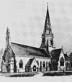 The Boltons, a street in Brompton, was farmland until the middle of the 19th century. As part of westward expansion of London the land was developed by Robert Gunter the elder, who planned a residential estate, together with a church, to lend tone to the area.[3][4] The church, built to a design by George Godwin the younger (who was also responsible for St Jude's, Courtfield Gardens, and St Luke's Church, Redcliffe Gardens) on land given by Gunter in the centre of the proposed development, was erected before the estate was built[3] and was the first parish to be made out of the larger parish of Holy Trinity, Brompton, which since 1829 had covered much of Brompton.[3] The cost of the church was £6,000 (equivalent to £810,000 in 2023),[5] and the Church Building Commission gave a grant of £85 towards its construction.[6] It was consecrated on 22 October 1850.[4] The church's first incumbent, Rev. Hogarth J. Swale, met most of the building costs of the church.[3] In July 2006 St Mary's Parish absorbed the parish of St Jude's, Courtfield Gardens, doubling its size.[4]