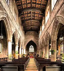 St Mary and All Saints Church is in the centre of the village of Great Budworth, Cheshire, England. It is an active Anglican parish church in the diocese of Chester, the archdeaconry of Chester and the deanery of Great Budworth.[1] The church is recorded in the National Heritage List for England as a designated Grade I listed building.[2] Clifton-Taylor includes it in his list of 'best' English parish churches.[3] Richards describes it as "one of the finest examples of ecclesiastical architecture remaining in Cheshire".[4] The authors of the Buildings of England series express the opinion that it is "one of the most satisfactory Perpendicular churches of Cheshire and its setting brings its qualities out to perfection".[5]