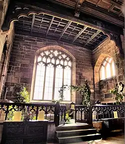 In the north chapel is a memorial to Sir Peter Leicester, the 17th-century historian, and in the Warburton Chapel is the alabaster effigy of Sir John Warburton who died in 1575.[4] In the north chapel is an organ which was designed by Samuel Renn and installed in 1839. It is recognised by the British Institute of Organ Studies as being an "Organ of Historic Importance". The organ was restored in 2004 by Goetze and Gwynn at a cost of £60,000.[9] There is a ring of eight bells, all cast by Rudhall of Gloucester. Six of these are dated 1733, one is dated 1760 and the other 1822.[10] The parish registers begin in 1559 and the churchwardens' accounts date back to 1699.[4]