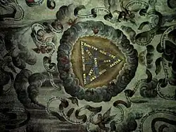 Between the nave and the north aisle is a two-bay arcade in Early English style. In the east wall of the chancel is a re-set piscina, and the south wall contains a 14th-century tomb recess. The ceiling of the chancel was painted in 1672 by Thomas Francis. It depicts the Shield of the Trinity surrounded by cherubs and texts, and angels holding a bible open at Psalm 85. The reredos consists of a triptych dating from about 1890 by the artist Charles Edgar Buckeridge. Also in the church are the Royal Arms of Charles II. The stained glass consists of a large series designed by Kempe dating from 1890 to 1922.[4] The two-manual pipe organ was built in 1866 by J. W. Walker. It was reconstructed and enlarged in 1890, and overhauled in 1991, on each occasion by Walker's.[5] There is a ring of six bells. Five of these were cast in 1737 by Abel Rudhall, and the sixth in 1890 by John Taylor and Company. The church has a Sanctus bell also made by Taylor's at about the same date.[6]