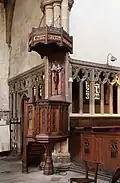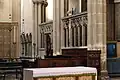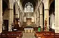 The interior has a continuous, stenciled waggon ceiling covering both nave and chancel. The high altar in the chancel is surmounted by a stenciled reredos depicting the Risen Christ with seven lamps hanging above. There is also a threefold Sedilia in the south wall of the Sanctuary. The north chapel has a stone quadripartite ribbed vaulted ceiling and an Easter Sepulchre. The South Aisle contains the organ and a side chapel at the east end, a Calvary Scene and a shrine of Our Lady of Walsingham. A set of fourteen Stations of the Cross surround the nave in both the north and south aisles. At the west end there is a Font with an intricate 19th century cover. Since 2015 the Church has hosted a contemporary art installation behind the font by the Royal Academy's Maciej Urbanek. The Work, titled 'HS', presents an abstract and subversive take on the classic image of the Holy Spirit descending as beams of light. It won the 2015 ACE Award for Art in a Religious Context.[3] The church is Grade II* listed, for its interior.[4]