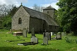 The datable elements of the church are from the 15th century, although its origins may be earlier, it sits in a circular churchyard and an earlier sculpture has been incorporated into its South wall near the tower.[1] The similarities of the roof-line and tower with those at St Cadoc's Church, Llangattock-juxta-Usk may suggest the involvement of the Gloucestershire engineer John Upton in a Victorian rebuilding, although there is no documented evidence of this.[1] Upton also undertook work at the nearby Pant-y-Goitre Bridge. [2] The architectural historian John Newman writes that the church was "lightly restored in 1925".[3] St Michael’s is now closed. It remains a Grade II* listed building.[1]