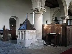 The inside of the church has Elizabethan features as well as Norman.[3] The Elizabethan furnishings remain unaltered. As a result, the church was included in John Betjeman's Top 100 Churches in England. There are panelled screens and box pews and more oak furnishings. These date from the 16th century.[3]
