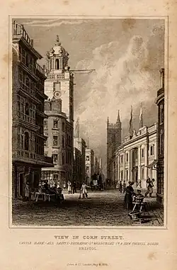 Printed engraving from 1829 of the view westwards along Corn Street, Bristol, showing the original position of St Werburgh's church on the north side of the road beyond the Register Office (then the Council House). Also shows All Saints' Church on the south side of the road before The Corn Exchange building. In the foreground is Castle Bank on the south side of Corn Street, destroyed during the Bristol Blitz. The engraving also shows a street scene with numerous figures, market stalls, and a horse and cart.