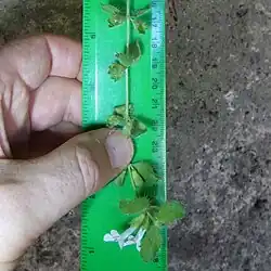 It is a very finely long-hairy plant, with large, oval, broad-toothed leaves, and with medium-spaced (1-4 cm apart) whorls of white flowers set along flowering stems that tend to hang downwards. There are mostly 2 flowers per whorl, which distinguishes it from the similar Stachys pinardii nearby which generally has 4 or more per whorl. [2]