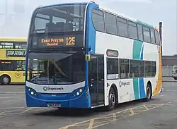 Stagecoach has experimented with fleets of zero-emissions vehicles in co-operation with Merseytravel within the Liverpool City Region. In 2018, a Volvo 7900e battery electric bus equipped with a pantograph charger was trialled on services 82 and 86 between Liverpool One bus station and Liverpool John Lennon Airport, with a charging station manufactured by ABB installed at the former.[24] Stagecoach also has taken delivery of ten Alexander Dennis Enviro400FCEV fuel cell buses for joint operation with Arriva North West of service 10A between Liverpool and St Helens via Knowsley,[25][26] however Stagecoach's buses remained out of service until mid-2024 due to a hydrogen fuel supply shortage.[27] Two Yutong E10 battery electric buses are based at Preston for use on contracted runs from Preston to the BAE Systems site at Warton Aerodrome.
